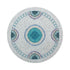 Round decorative mat with a blue center and multicolored border, shown with dimensions on a white background.
